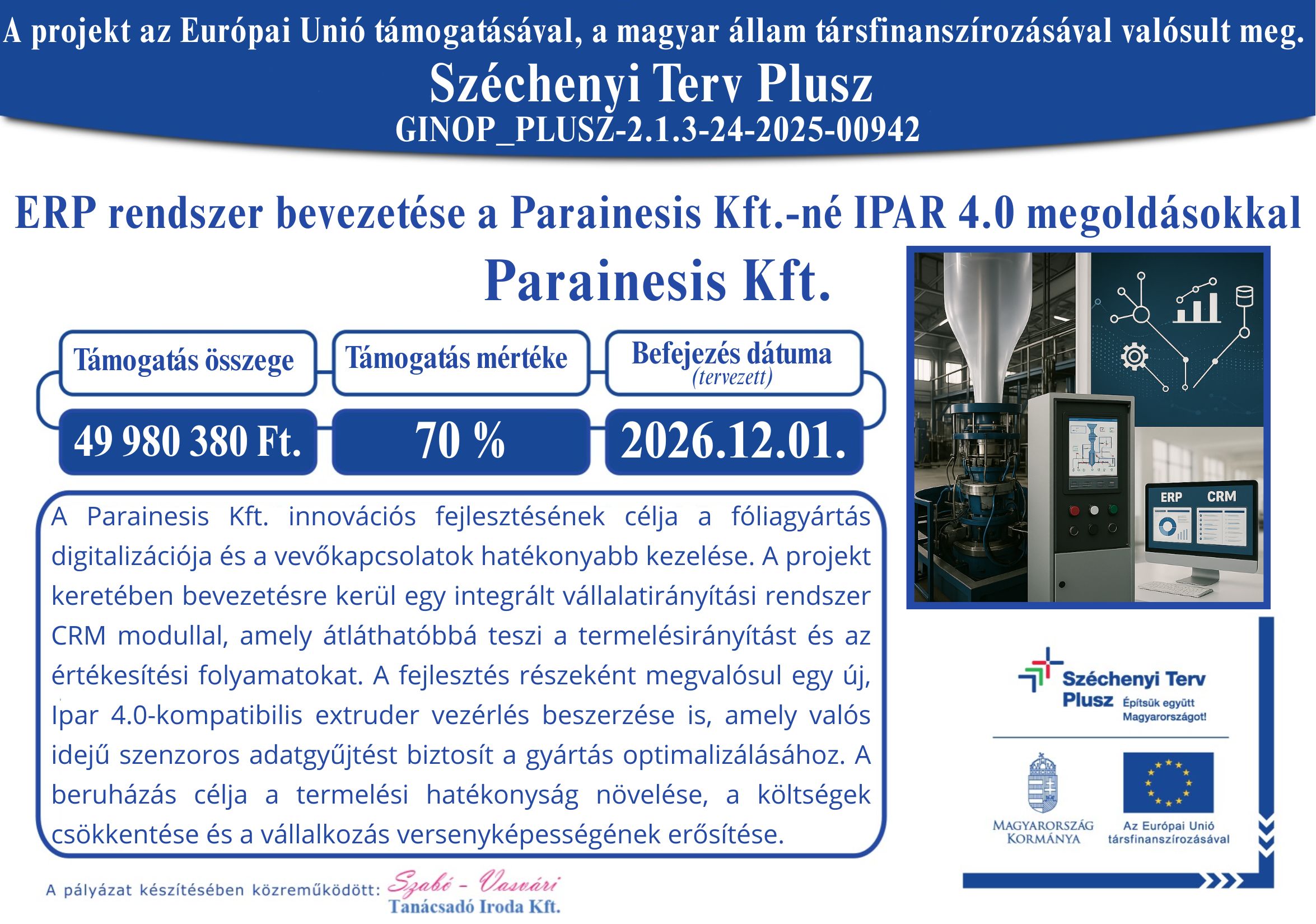 - a projekt címe: Energetikai fejlesztések a PARAINESIS KFT üzemében